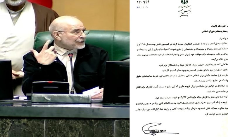 پس از آنکه کمیسیون تلفیق مجلس تصمیم گرفت کلیات لایحه بودجه 1405 را رد کند، مسعود پزشکیان در اقدامی پیشدستانه در نامهای تلویحاً لایحه بودجه را پس گرفت. محمد باقر قالیباف در واکنش به این نامه گفت: «نامه آقای رئیسجمهور به این معناست که هم نوعی استرداد لایحه بودجه محسوب میشود و هم اصلاح همزمان آن.» اصل نامه و توضیحات قالیباف را میبینید و میشنوید.