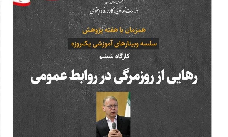 به گزارش خبرنگار دولت جهانی مگ آنلاین، در ادامه برنامه‌های آموزشی وزارت تعاون، کار و رفاه اجتماعی و همزمان با «هفته پژوهش»، کارگاه ششم از سلسله وبینارهای آموزشی یک‌روزه با عنوان «رهایی از روزمرگی در روابط عمومی» برگزار می‌شود.