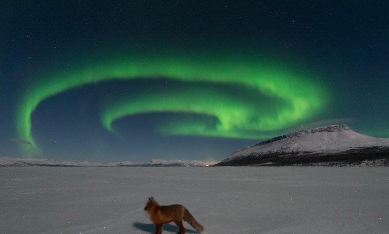این صحنه برفی با نور ماه روشن شده است. «سانا»(Saana) که یک کوه نمادین لاپلند است، در سمت راست پسزمینه عکس دیده میشود اما همان طور که شفقهای شمالی زیبا در آسمان میرقصیدند، یک روباه وحشی با شور و شوق به دور عکاس و تجهیزاتش میدوید و ثبت یک عکس تکی از شفق قطبی را دشوار میکرد.