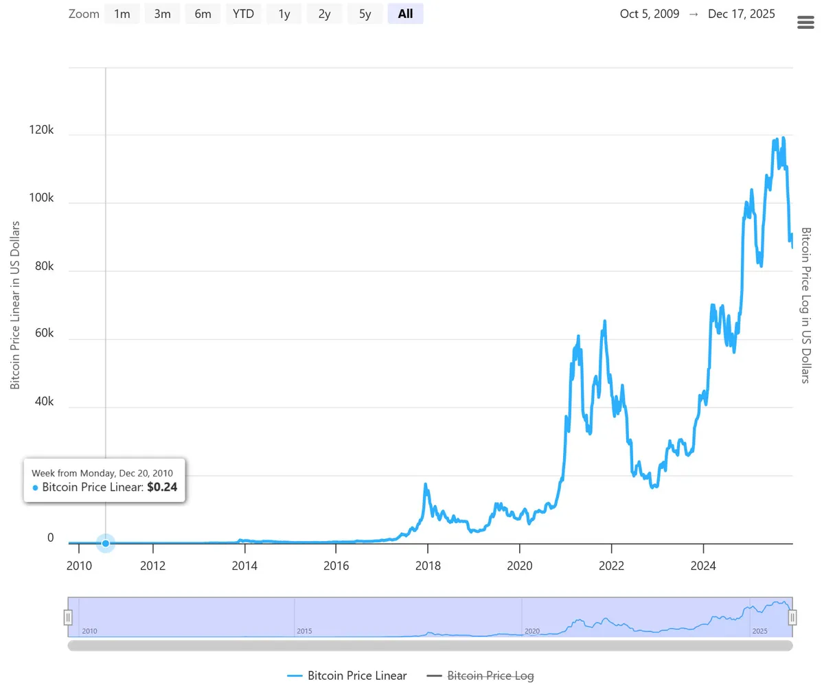 امروزه، هر بیتکوین تقریباً ۸۶,۰۰۰ دلار ارزش دارد؛ هرچند تنها چند هفته پیش برای مدت کوتاهی از ۱۲۵,۰۰۰ دلار نیز گذشته بود. این ارقام نشاندهنده افزایش حدود ۴۰۰,۰۰۰ برابری ارزش بیتکوین از دسامبر ۲۰۱۰ است.